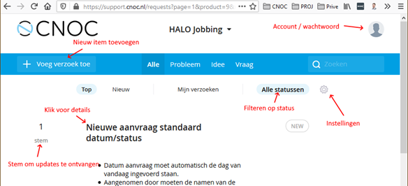 Inloggen op https://support.cnoc.nl met gebruikersnaam / wachtwoord.